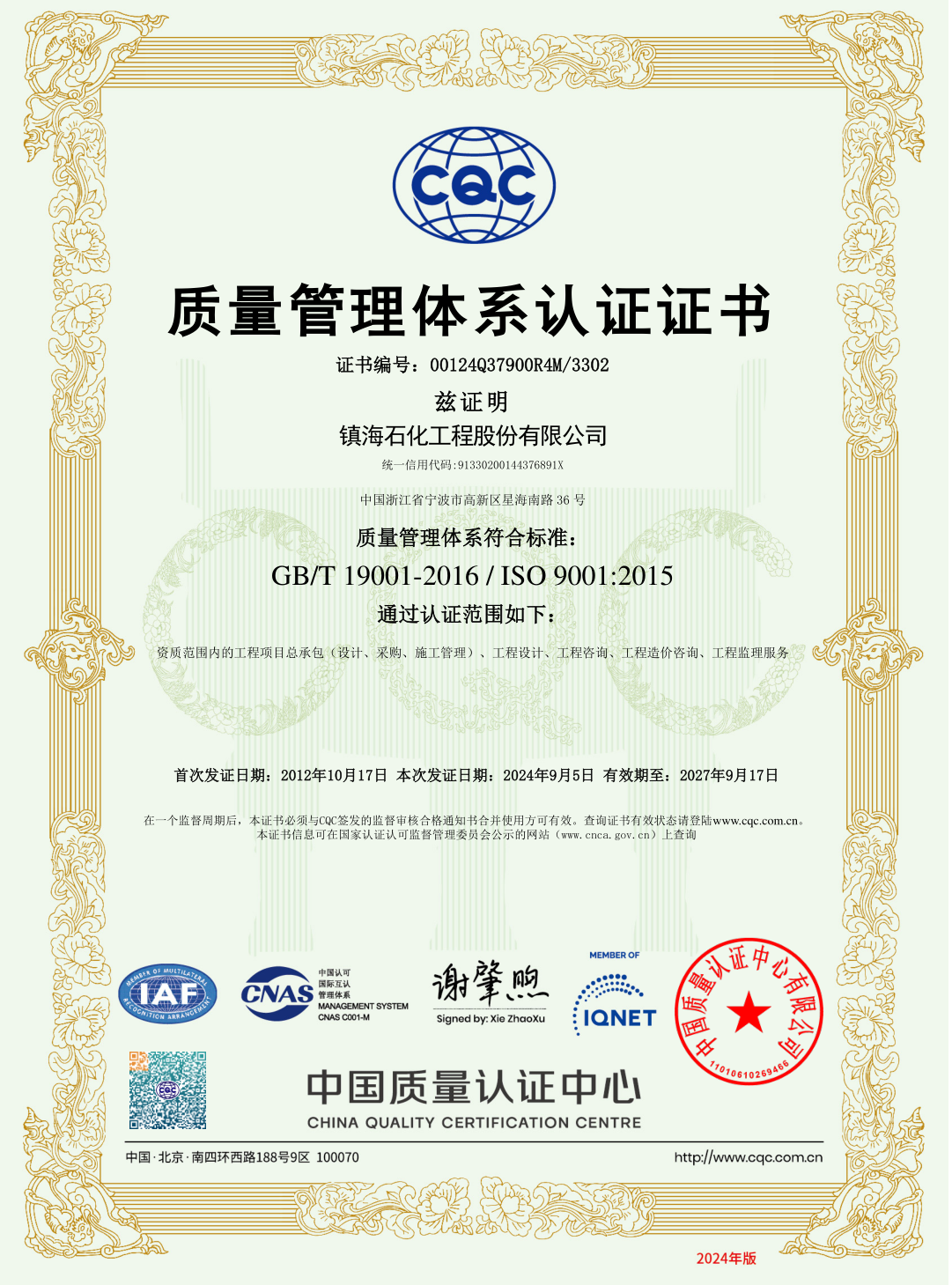 质量管理体系认证证书