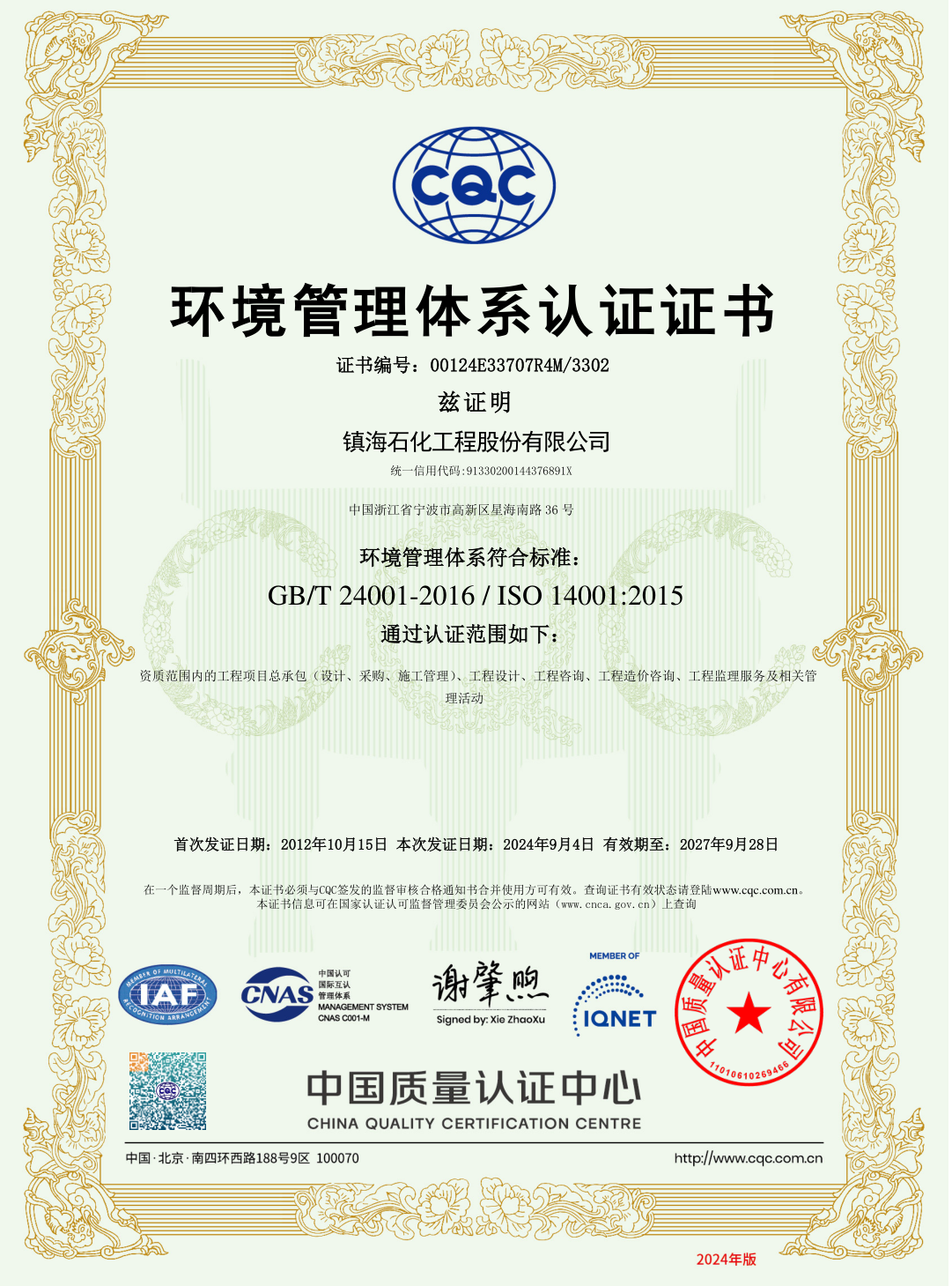环境管理体系认证证书