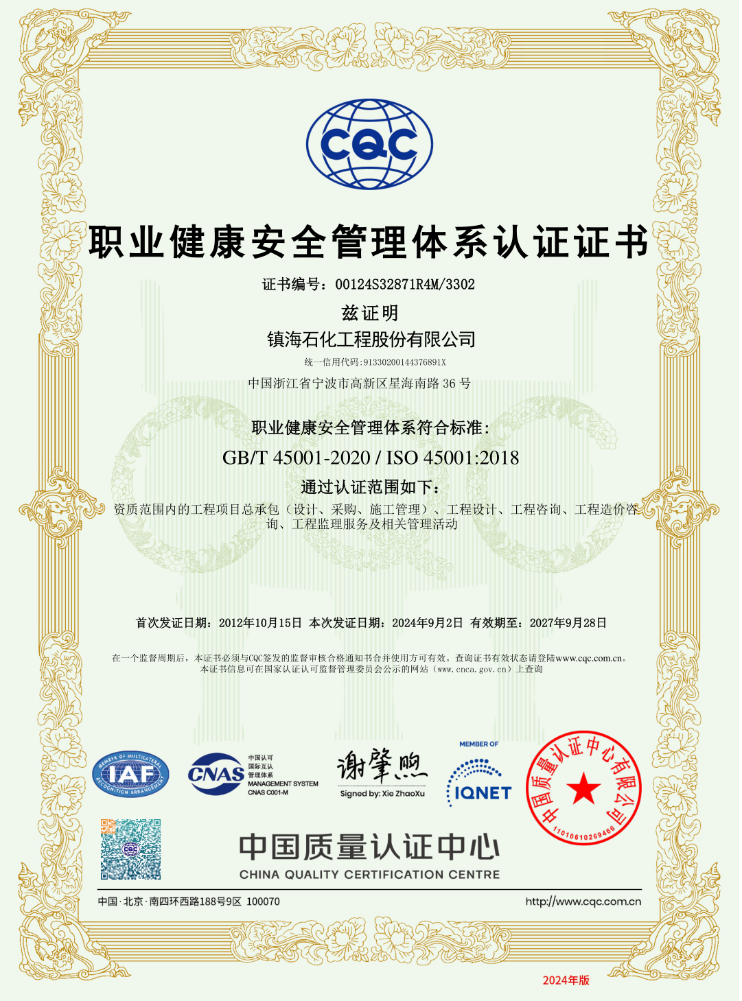 职业健康安全管理体系认证证书
