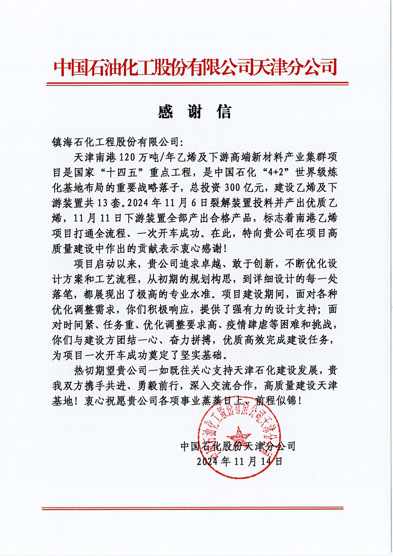 近日,天津南港120万吨/年乙烯及下游高端新材料产业集群项目一次开车成功并打通全流程,生产出合格产品,标志着中国石化天津基地成为中国石化乙烯规模最大的产业基地之一。