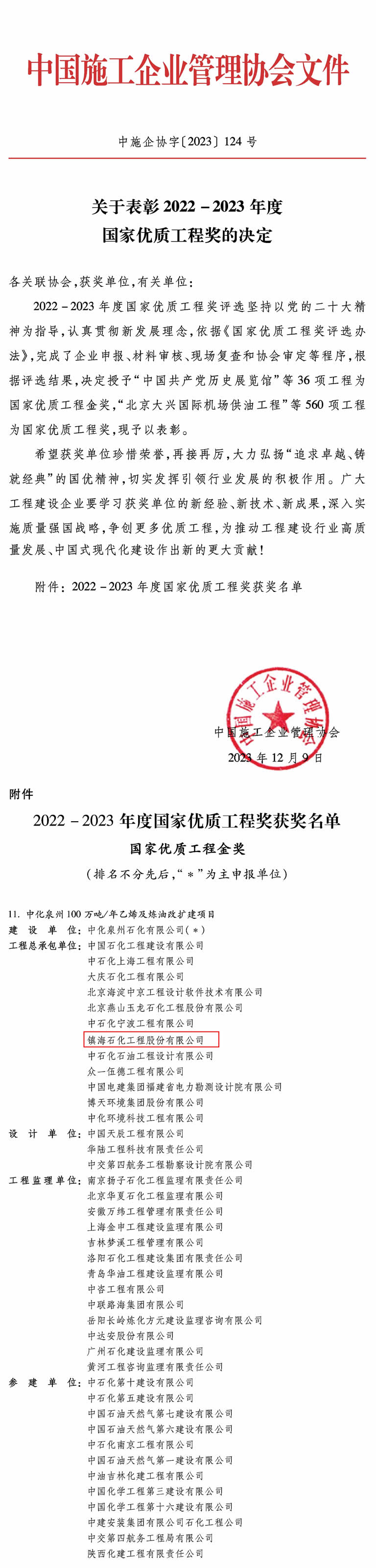 国家优质工程奖设立于1981年,是我国工程建设质量方面跨行业、跨专业的国家级荣誉奖励,是目前经国务院确认的我国工程建设行业设立最早、规格最高的国家级质量奖,国家优质工程金奖为最高奖。该奖项每两年表彰一次,评定涵盖了从工程立项到竣工验收全过程的各个重要程序和环节,在行业内具有示范引领作用,是我国工程建设质量领域奖项的天花板。