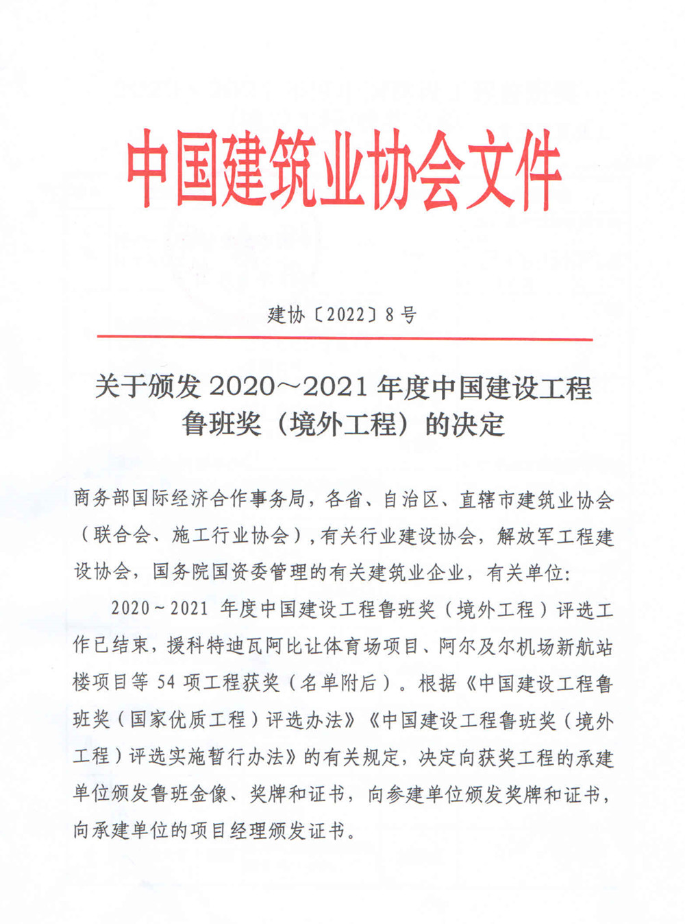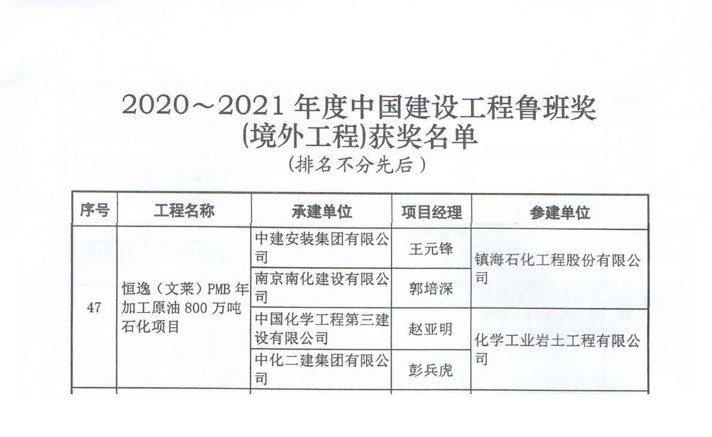 日前,中国建筑业协会公布《关于颁发2020-2021年度中国建设工程鲁班奖(境外工程)的决定》。公司EPC参与的恒逸(文莱)PMB石油化工项目名列其中,荣获2020—2021年度“中国建设工程鲁班奖(境外工程)”。