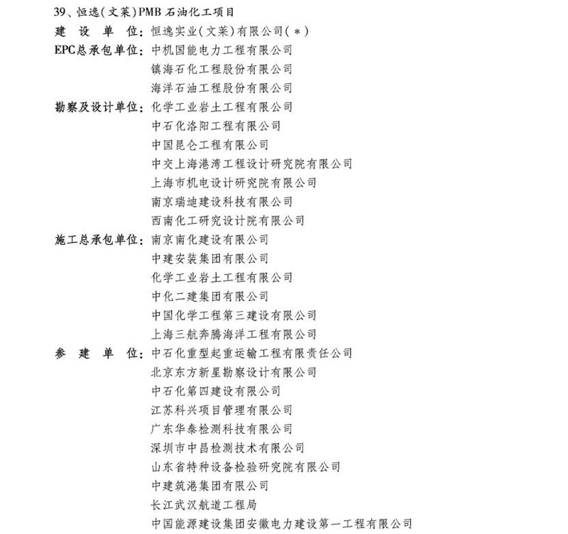2021年12月6日,中国施工企业管理协会发布《关于表彰2020—2021年度国家优质工程奖的决定》。由公司参与EPC的恒逸(文莱)PMB石油化工项目荣获2020—2021年度国家优质工程金奖。