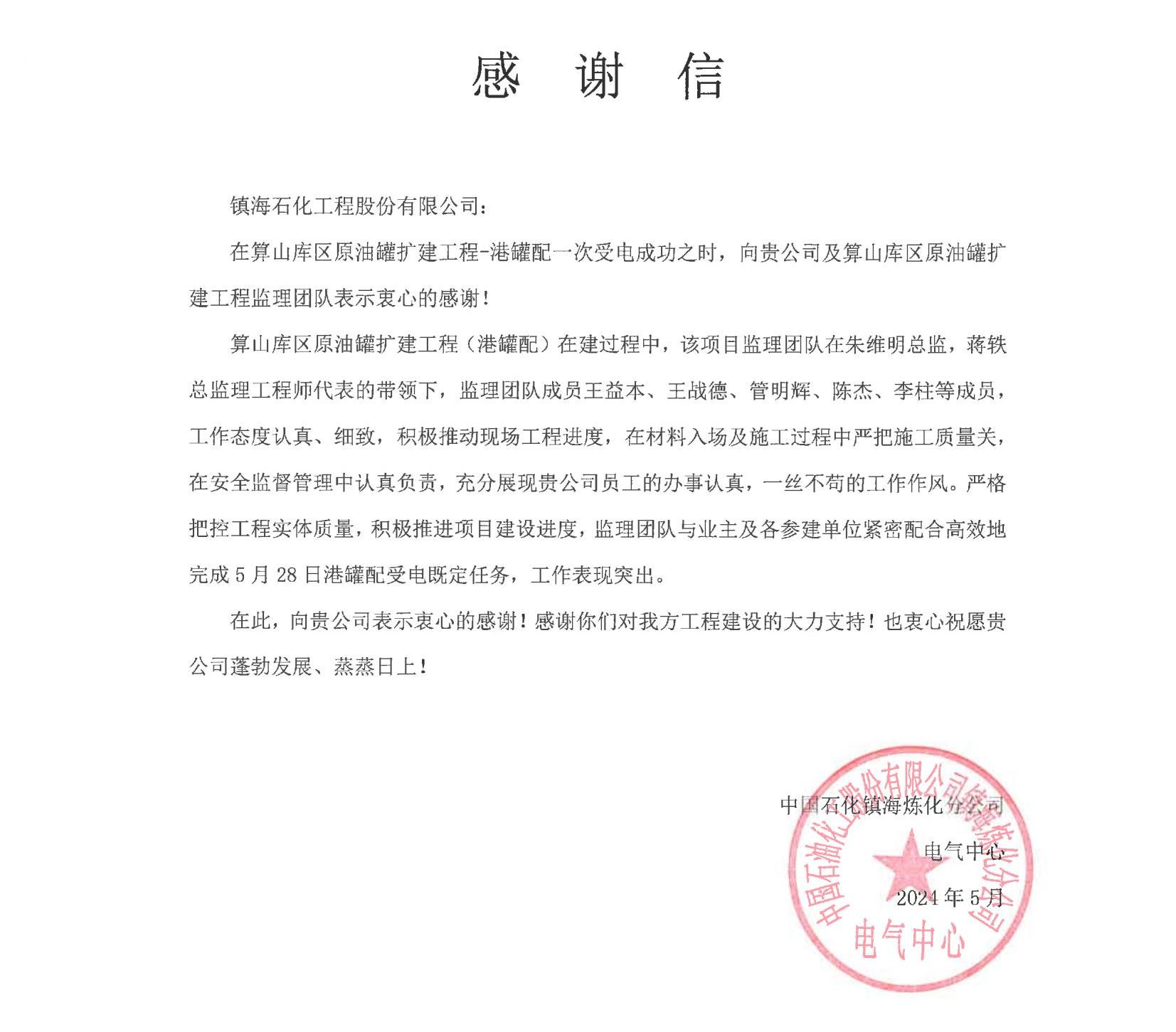 该项目在总监理工程师朱维明、总监理工程师代表蒋轶的团结带领下,监理团队成员积极主动、凝心聚力、密切协作,严格落实各项质量安全监管工作,加快推进项目建设进度,提前完成了变电所受电任务,获得了业主的一致认可,并收到了业主的感谢信。